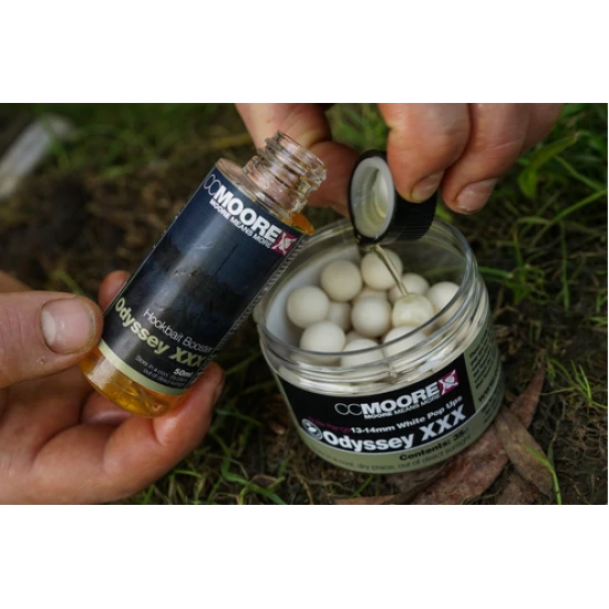 Geben Sie Ihren Odyssey XXX Pop Ups/Hookbaits eine leichte Schicht des kraftvollen passenden Hookbait Boosters, lassen Sie ihn trocknen und wiederholen Sie den Vorgang bei Bedarf. Wiederholte Flüssigkeitsbeschichtung von Pop-Ups kann deren Auftrieb verringern.